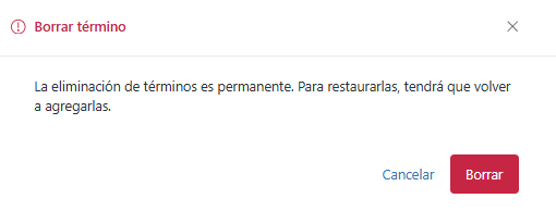 Puede borrar los términos excluidos que ya no desea que la traducción generada por IA pase por alto. Una vez que se borra un término excluido, el término se traducirá junto con el resto del contenido del artículo, salvo que lo vuelva a agregar a la lista de términos excluidos.