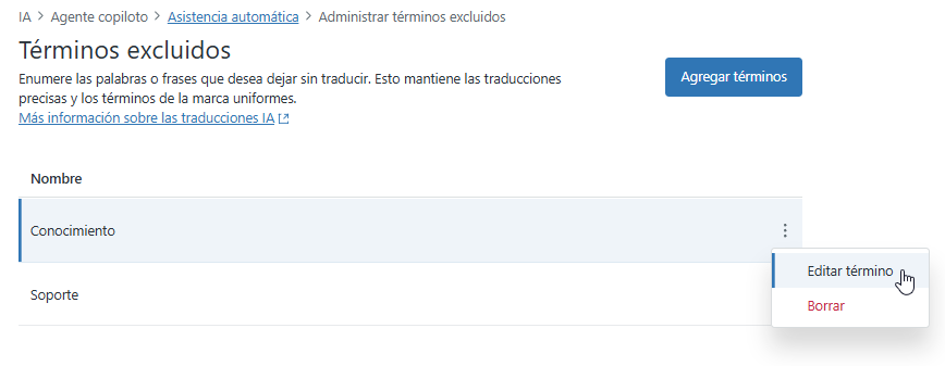 Puede agregar hasta 300 palabras o frases a la lista de términos excluidos para asegurarse de que no se traduzcan en las traducciones generadas por IA.