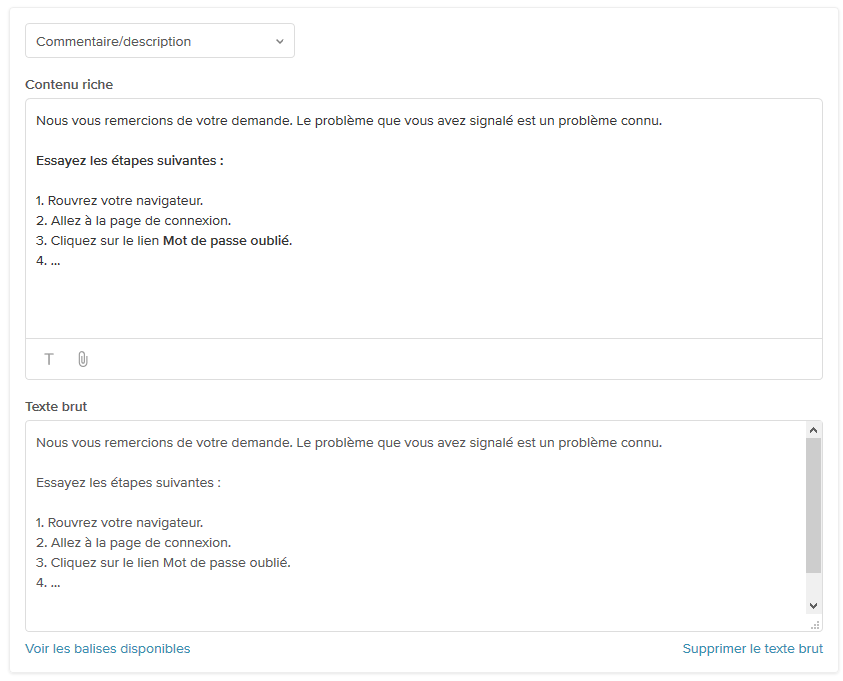 Si vous avez ajouté des styles, du formatage ou des images incorporées à l’action de macro Commentaire/description, vous pouvez ajouter une version en texte brut si vous le souhaitez.