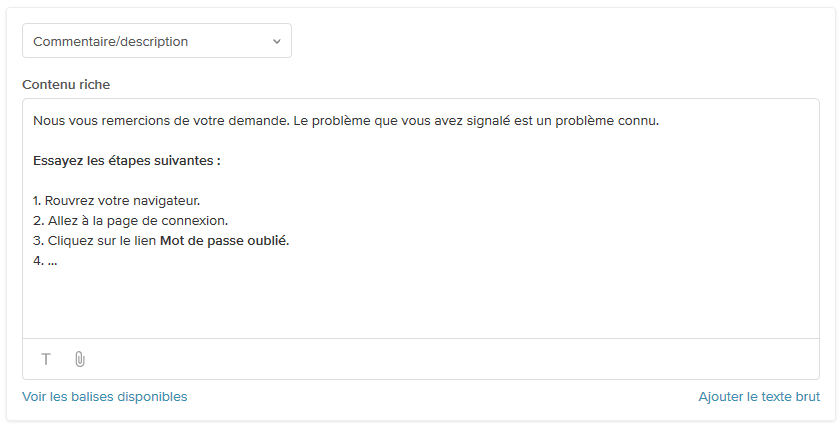 Si le formatage de texte riche est activé, vous pouvez ajouter du style et du formatage ainsi que des images incorporées à l’action de macro Commentaire/description. Ce paramètre doit être activé par un administrateur. Pour en savoir plus, consultez Activation des options de formatage pour les agents..