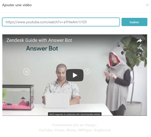Votre vidéo doit être hébergée sur Vimeo, YouTube, Wistia, JWPlayer ou Brightcove. Si votre vidéo est hébergée par l’un des services pris en charge, vous pouvez suivre cette procédure pour l’insérer. Vous n’avez pas besoin d’activer l’option autorisant l’affichage du contenu non sécurisé dans votre Centre d’aide.