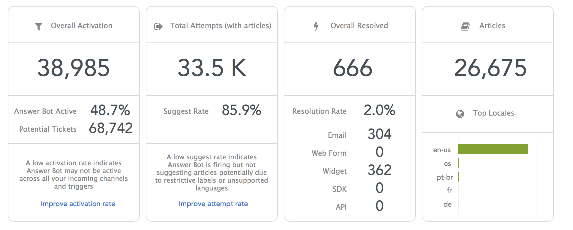 - Resolution Rate : le pourcentage de demandes d’assistance résolues par Answer Bot via le Web Widget sur le nombre total de réponses d’Answer Bot.