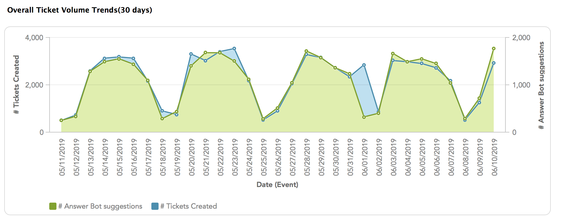Le graphique des tendances générales en matière de volume de tickets (30 jours) d’Answer Bot affiche le nombre de tickets créés par rapport au nombre de suggestions faites par Answer Bot. Cela vous permet d’analyser si Answer Bot a été activé correctement pour toutes les questions entrantes auxquelles vous voulez qu’Answer Bot essaie de répondre.