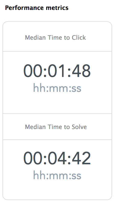 Deux mesures peuvent vous aider à mesurer les performances d’Answer Bot. Elles se trouvent sur la droite des mesures Answer Bot Performance et peuvent vous aider à savoir à quelle vitesse vos articles suggérés aident vos utilisateurs.