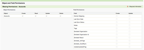 Si vous n’ajoutez pas ces champs à la mise en page avant de configurer la synchronisation, vous verrez une section intitulée Objects and field permissions (autorisations pour les objets et les champs) répertoriant toutes les autorisations de champ manquantes à la page des paramètres. Vous devrez ajouter les champs à votre mise en page pour résoudre ce problème.
