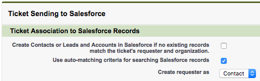 Cela garantit qu’une recherche sera effectuée dans les enregistrements de piste ET de contact dans Salesforce pour trouver un demandeur correspondant dans Zendesk. Les utilisateurs peuvent configurer jusqu’à trois critères (la condition logique OU est utilisée si plusieurs critères sont configurés). Si vous ne cochez pas cette option, les critères par défaut sont utilisés :