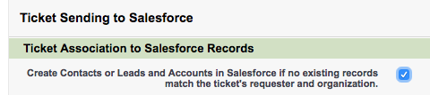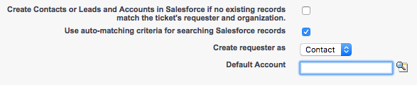 - Supprimez la coche devant la case Create Contacts and Accounts in Salesforce (Créer des contacts et des comptes dans Salesforce) si vous ne voulez pas créer de nouveau contact ou de nouveau compte dans Salesforce quand aucune correspondance n’est trouvée pour le demandeur ou l’organisation du ticket.