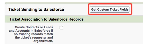 - Dans la section Ticket Sending to Salesforce (Envoi des tickets à Salesforce), cliquez sur Get Custom Ticket Fields (Récupérer les champs de tickets personnalisés).