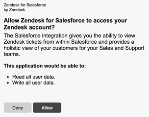 Vous devez être un administrateur Zendesk (ou vous assurer de l’assistance d’un administrateur Zendesk) et disposer des droits d’administrateur Salesforce pour effectuer l’authentification dans Zendesk.
