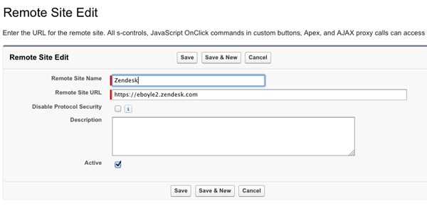 - Remote Site Name (Nom du site distant) : donnez un nom à votre site Zendesk connecté.