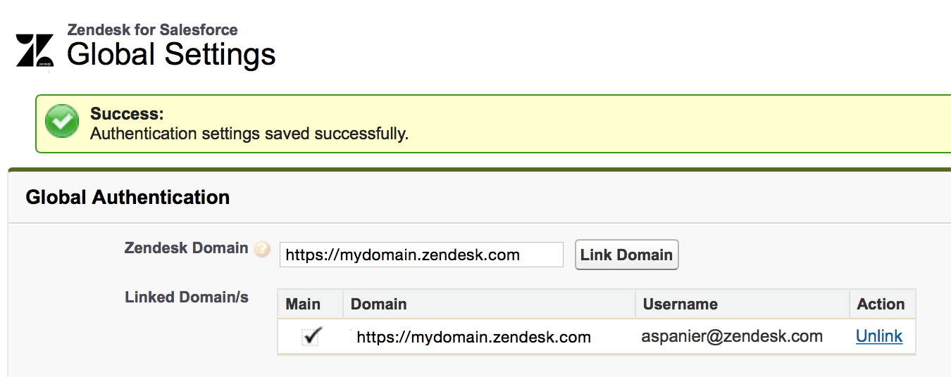 - Dans la section Global Authentication (Authentification globale), saisissez le domaine Zendesk utilisé dans vos paramètres de site distant.