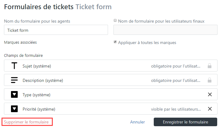 ) du formulaire de ticket que vous voulez supprimer. - En bas du formulaire de ticket, cliquez sur Supprimer le formulaire.