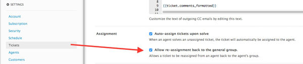 Les administrateurs peuvent affecter des tickets à n’importe quel groupe. Les agents peuvent affecter des tickets (manuellement ou via une macro) à tout groupe auquel ils appartiennent s’ils ont les autorisations appropriées ou si l’administrateur a activé la réaffectation aux groupes dans les paramètres de tickets :