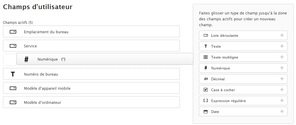 ) dans la barre latérale, puis sélectionnez Champs d’utilisateur. - Sélectionnez un type de champ personnalisé sur la droite, puis faites-le glisser dans la zone des champs actifs et placez-le à l’emplacement de votre choix. Vous pouvez aussi cliquer sur le signe Plus (+) à côté du champ que vous voulez ajouter.