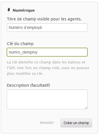 - Saisissez le Titre de champ visible pour les agents et la Clé du champ dans le panneau des propriétés sur la droite.