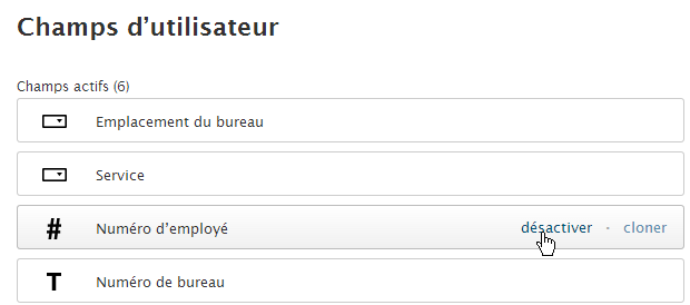 - À la page d’administration des champs d’utilisateur, passez le curseur de la souris sur le champ personnalisé que vous voulez cloner, puis sélectionnez Cloner.