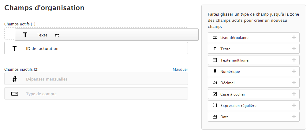 ) dans la barre latérale, puis sélectionnez Champs d’organisation. - Sélectionnez un type de champ personnalisé sur la droite, puis faites-le glisser dans la zone des champs actifs et placez-le à l’emplacement de votre choix. Vous pouvez aussi cliquer sur le signe Plus (+) à côté du champ que vous voulez ajouter.
