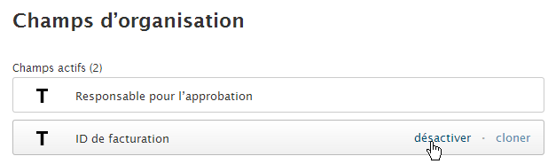 - À la page d’administration des champs d’organisation, passez le curseur de la souris sur le champ personnalisé que vous voulez cloner, puis sélectionnez Cloner.