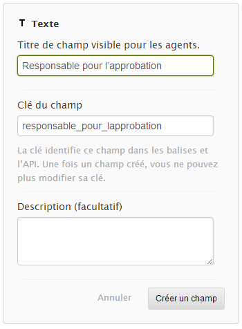 Vous ne pouvez pas modifier la clé du champ une fois le champ d’organisation personnalisé créé. La clé du champ est utilisée par les balises API et Liquid, c’est le seul paramètre de champ qui n’est pas modifiable une fois configuré.
