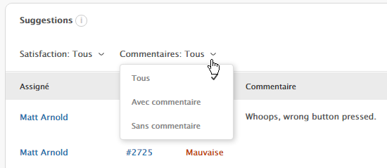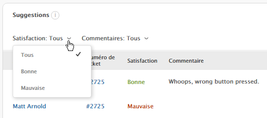 - Pour filtrer par note de satisfaction, cliquez sur Satisfaction : Toutes, puis sélectionnez Bonnes ou Mauvaises.