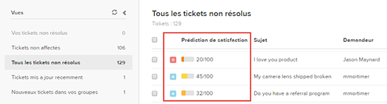 Vous pouvez trier les tickets de cette vue par score de prédiction de satisfaction en cliquant sur l’en-tête de colonne.
