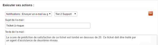 Vous pouvez utiliser les mêmes critères pour créer un déclencheur qui envoie un e-mail aux agents d’assistance de niveau 2, afin qu’ils interviennent dans le ticket à risque. De même, vous pouvez créer un automatisme pour vérifier régulièrement les tickets qui ont un mauvais score et envoyer le même e-mail.