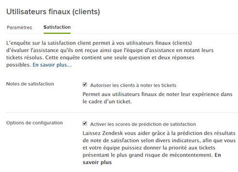 Une fois que vous avez reçu suffisamment de notes de satisfaction, les administrateurs peuvent activer la prédiction de satisfaction via l’onglet de Satisfaction.
