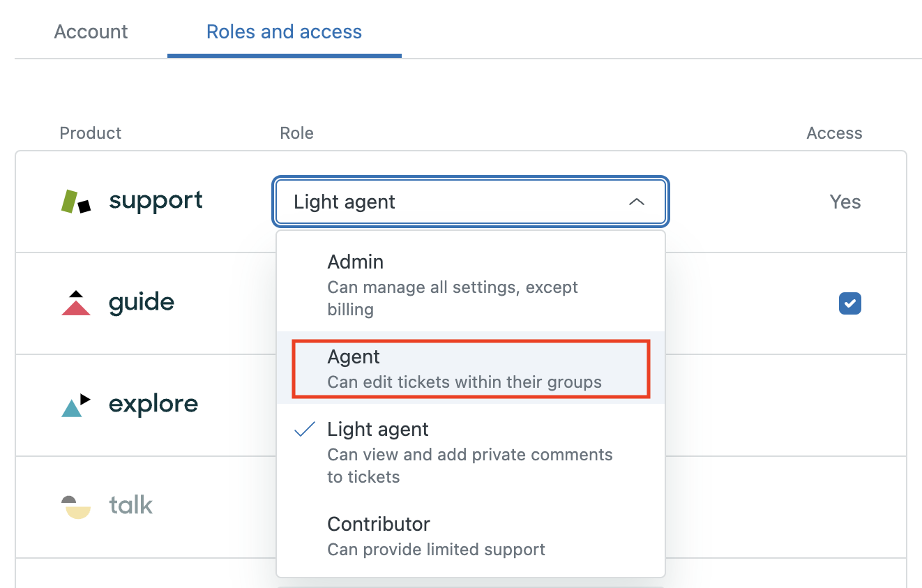 - Dans l’onglet Rôles et accès de la page de l’agent, ouvrez la liste déroulante Rôle pour Support et remplacez Agent light par Agent.