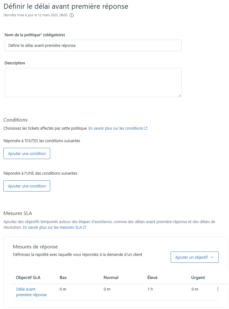 Pour vous aider à commencer à utiliser les SLA, Zendesk Support fournit un SLA standard, intitulé Définir le délai avant première réponse. On parle aussi de SLA système ou de SLA par défaut. Vous pouvez utiliser le SLA Définir le délai avant première réponse tel quel ou le cloner ou le modifier.