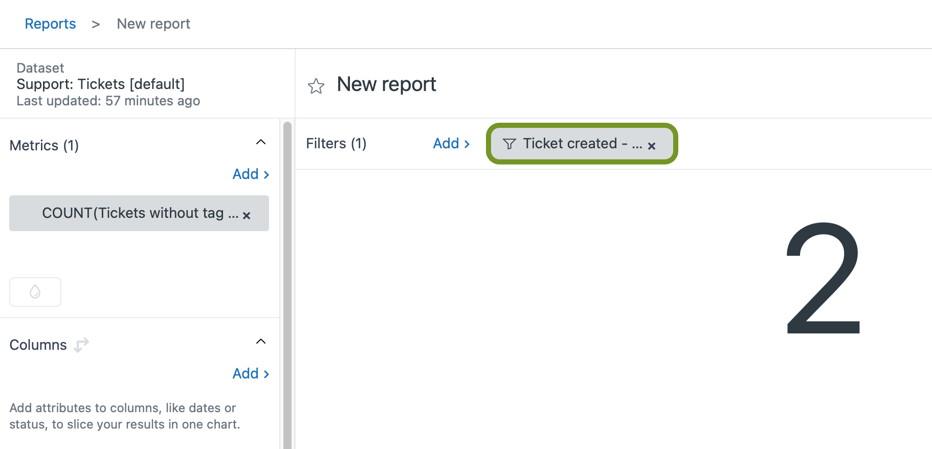 - Cliquez sur Appliquer. Le rapport devrait afficher vos tickets sans la valeur de marqueur. Vous pouvez aussi ajouter des filtresou modifier le filtre de dates par défaut en haut du rapport sur une plage de dates spécifique.