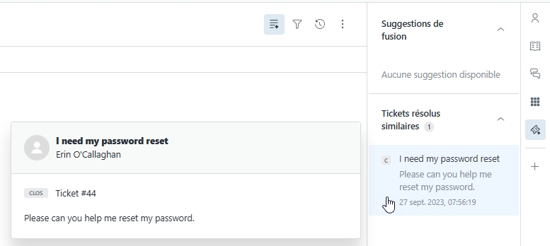 - Passez le curseur sur un ticket dans la section Suggestions de fusion ou Tickets résolus similaires dans le volet pour prévisualiser la suggestion.