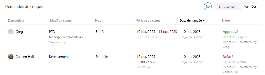 Vous pouvez voir qui a approuvé ou refusé les demandes dans la colonne Statut.