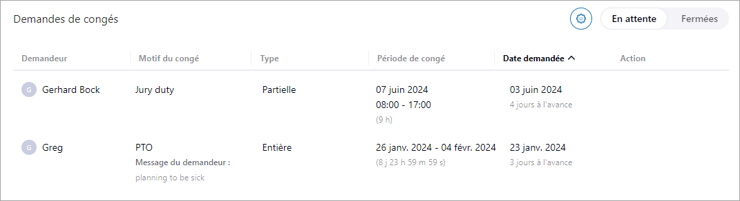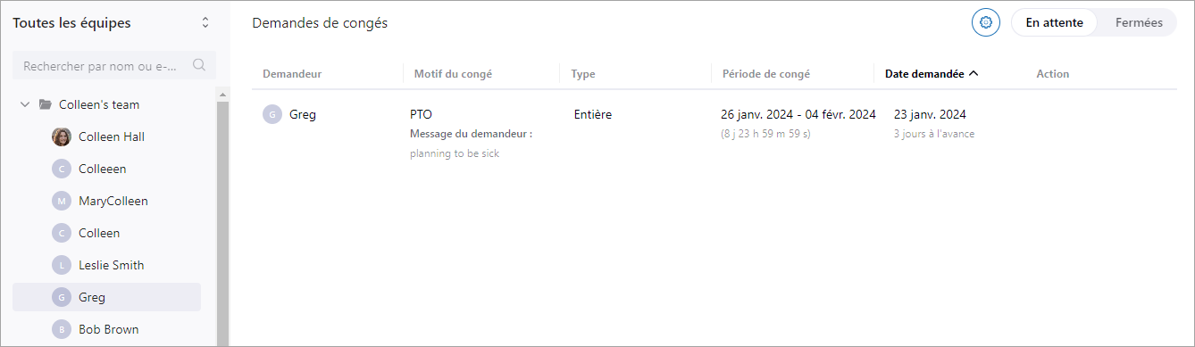 - Sélectionnez une équipe dans la barre latérale gauche pour voir ses demandes de congés.