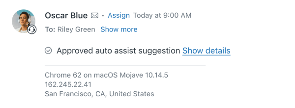 Quand l’assistance automatique exécute une action, cette action est consignée et clairement marquée dans la conversation de ticket, et elle ne vous est pas attribuée. Consultez Actions pré-approuvées pour en savoir plus.