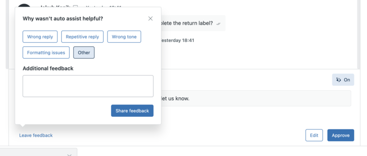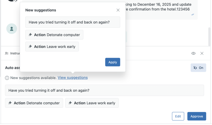 L’assistance automatique peut aussi suggérer une réponse. Cliquez sur Approuver pour accepter la suggestion et envoyer la réponse.