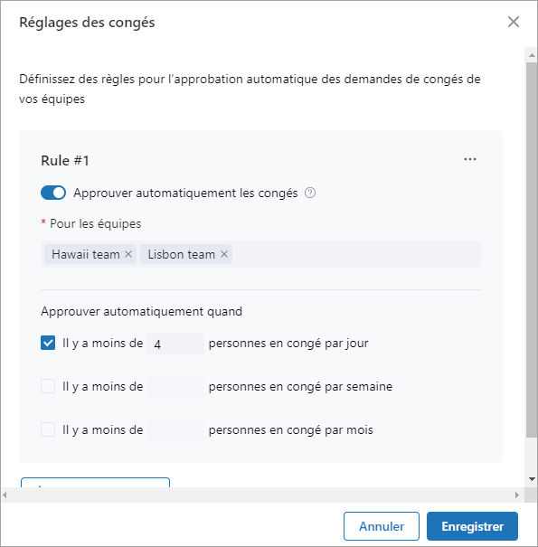 En créant des règles pour approuver automatiquement les demandes de congés des agents, vous pouvez gagner du temps, car vous n’avez plus à approuver chaque demande manuellement.