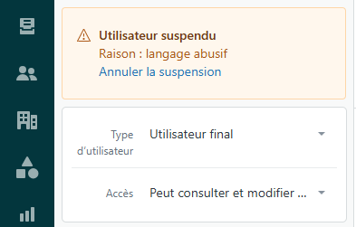 - Le statut Utilisateur suspendu est affiché en haut à droite de la page de profil de l’utilisateur final.