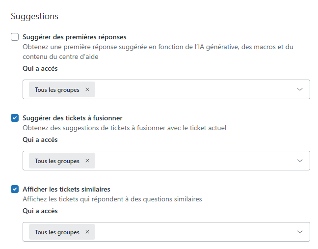 Les administrateurs peuvent activer ou désactiver les tickets similaires dans le Centre d’administration et choisir les groupes qui peuvent y accéder. Cette fonctionnalité est activée par défaut.