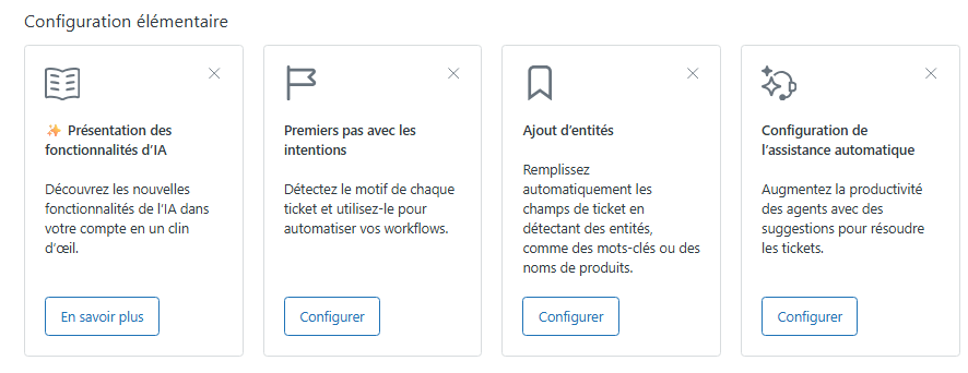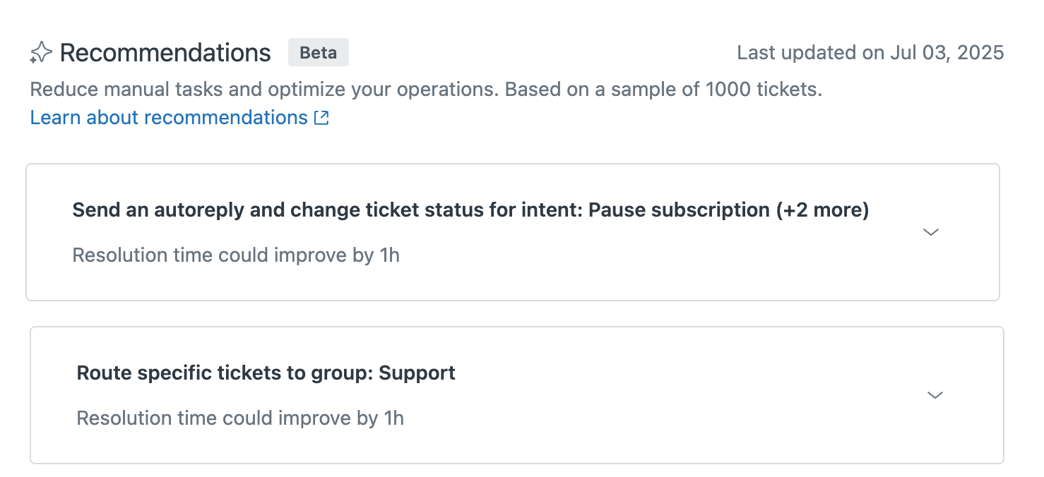 Quand vous commencez à utiliser l’IA, cette section vous fournit des recommandations optimisées par l’IA afin d’automatiser les tâches et ainsi de tirer le meilleur parti des fonctionnalités d’IA. Ces recommandations vous aident à améliorer vos workflows de tickets en créant ou en mettant à jour des déclencheurs. Des recommandations pour la configuration des réponses automatiques sont également fournies. Vos recommandations sont mises à jour toutes les semaines.