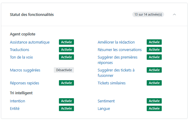 Utilisez la section Statut de la fonctionnalité pour savoir quelles fonctionnalités d’IA de Copilote sont activées dans votre compte. Cela vous aide à savoir quelles fonctionnalités vous devez encore activer.