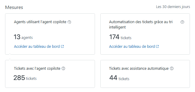La section Mesures affiche les mesures clés pour les fonctionnalités Copilote au cours du dernier mois. Ces mesures vous aident à évaluer l’utilisation des fonctionnalités et l’efficacité des tickets optimisés par l’IA. Les mesures sont mises à jour toutes les semaines.