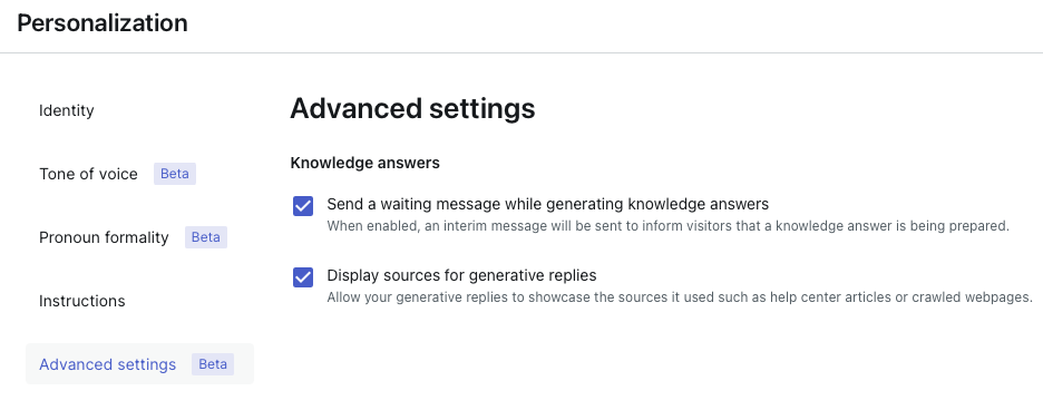 - Sélectionnez ou désélectionnez Envoyer un message d’attente lors de la génération de réponses de la base de connaissances.