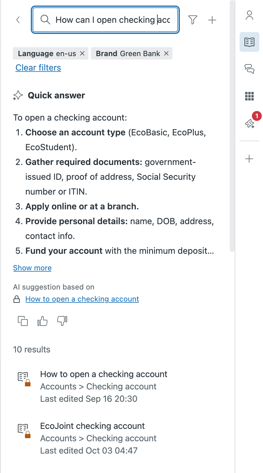 Les réponses rapides sont une fonctionnalité d'IA générative qui fournit des réponses résumées au-dessus des résultats de recherche lorsque les agents recherchent des informations sur un ticket. Auparavant, l’accès aux réponses rapides était limité aux clients disposant du module complémentaire Copilot. Avec cette version, les réponses rapides ne seront plus limitées aux utilisateurs de Copilot et seront désormais disponibles pour tous les utilisateurs ayant accès aux sections Espace de travail d’agent et Connaissances.
