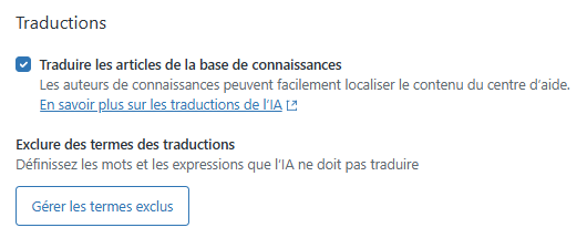 Vous pouvez configurer les traductions IA de façon à exclure jusqu’à 300 mots ou expressions spécifiques (fonctionnalité sensible aux majuscules et minuscules) que vous ne voulez pas traduire. Par exemple, ajoutez les noms de vos marques à la liste des termes exclus pour qu’ils restent dans la langue d’origine, quelle que soit la langue de traduction.