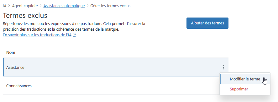 Vous pouvez supprimer un terme à exclure si vous ne voulez plus que les traductions générées par l’IA l’ignorent. Une fois que vous supprimez un terme à exclure, il sera traduit avec le reste de votre contenu, à moins que vous ne l’ajoutiez à nouveau à la liste des termes à exclure.