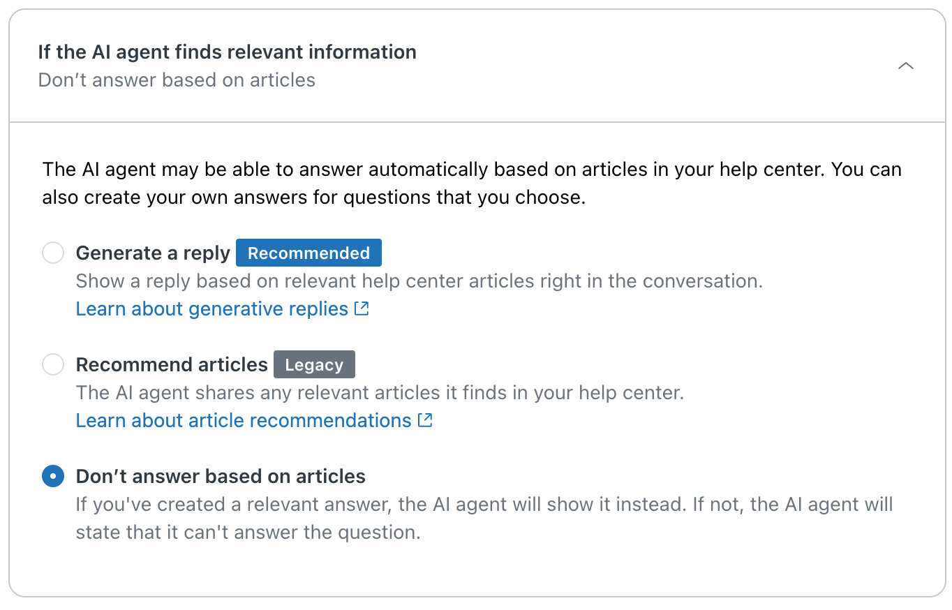 - Nella scheda Comportamento messaggistica , fai clic su Se l’ agenti AI trova informazioni pertinenti e seleziona Non rispondere in base agli articoli