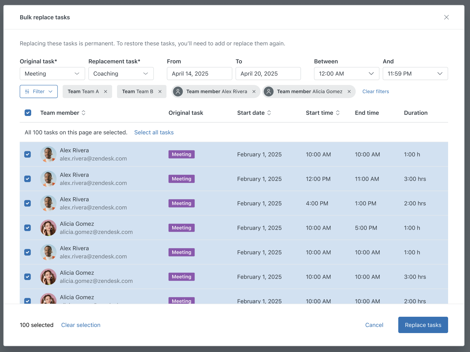 - Seleziona gli agenti per i quali vuoi sostituire l’attività.