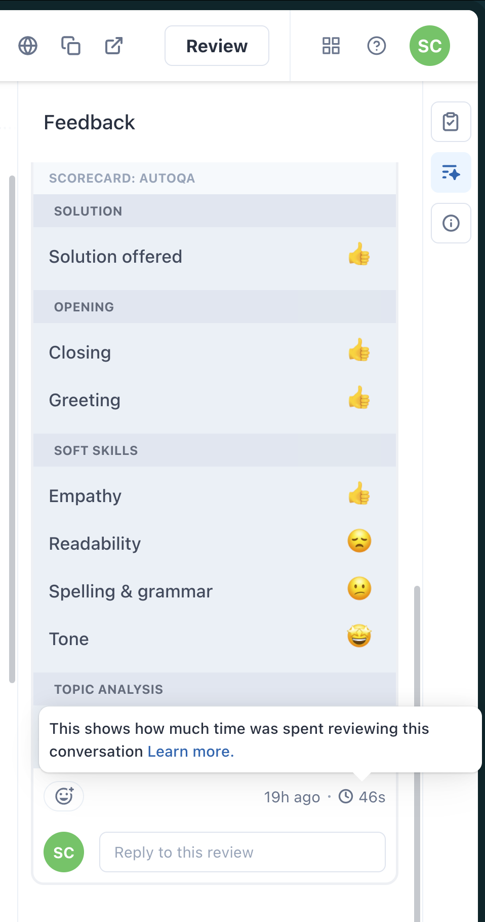 Tieni traccia del tempo di revisione per monitorare il tempo che dedichi alla valutazione delle conversazioni fino all’invio. Il tempo viene monitorato durante la visualizzazione delle conversazioni, l’uso dell’estensione del browser o le assegnazioni. Azioni come l’apertura di una nuova scheda o il monitoraggio delle pause di inattività. Visualizza i tempi medi di revisione nel dashboard per informazioni dettagliate. Questo aiuta nelle revisioni peer-to-peer, offrendo feedback diversificati e promuovendo una cultura collaborativa.