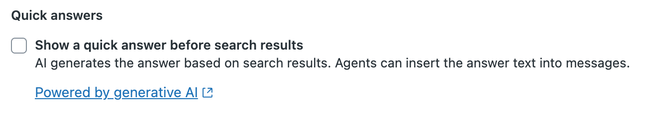 - Nella sezione Knowledge , sotto l’intestazione Risposte rapide , deseleziona Mostra una risposta rapida prima dei risultati della ricerca per disattivare le risposte rapide per Spazio di lavoro agente