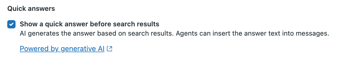 - Nella sezione Knowledge , sotto l’intestazione Risposte rapide , seleziona Mostra una risposta rapida prima dei risultati della ricerca per attivare le risposte rapide per Spazio di lavoro agente